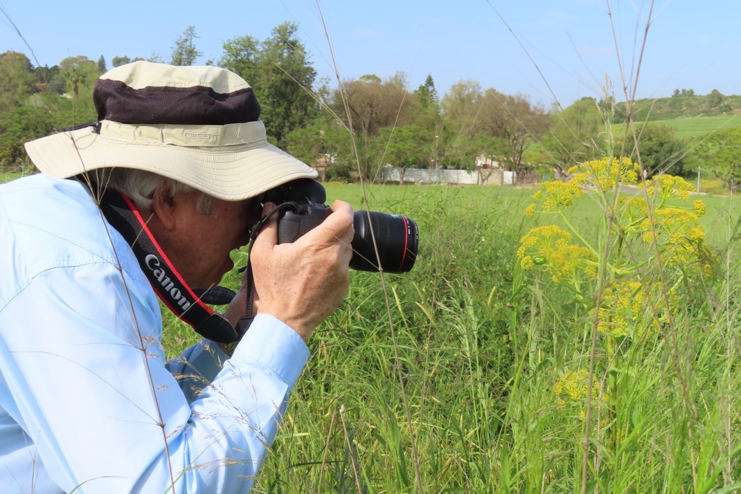 עמדה אופיינת של אורי במהלך צילום בטבע. אורי רוזנברג מצלם את נירית הקמה במישור החוף ליד ביתו ברחובות.