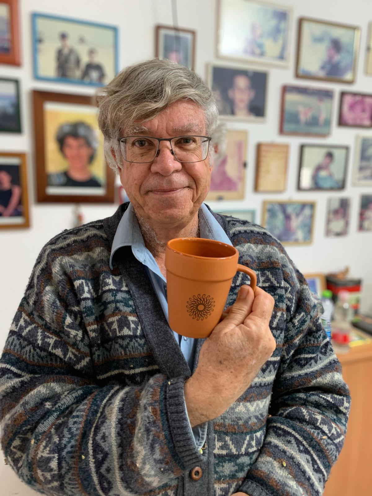 מימין: צילום בביתו של אורי רוזנברג ברחובות, ברקע הקיר מכוסה בצילומי המשפחה; אורי אוחז בספל של הגן הבוטני בהר-הצופים שם היה מתנדב בערוב ימיו.