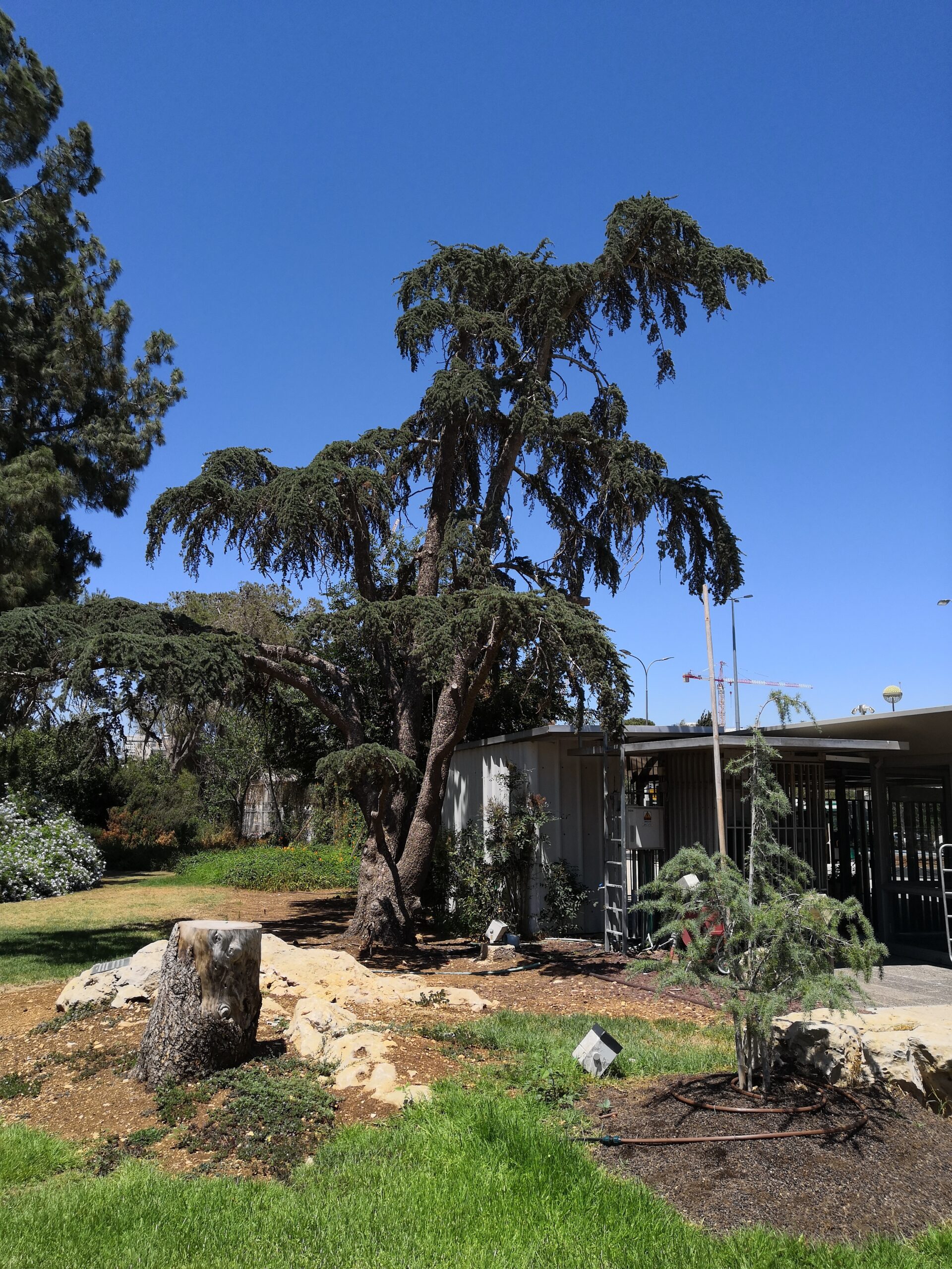 משמאל: עץ ארז הלבנון אשר נטע מיכאל אבישי (מנהל הגן-הבוטני בגבעת-רם) בשנת 1958 בגבעת רם, נפח את נשמתו עקב חוסר טיפול נאות בשנת 2018.