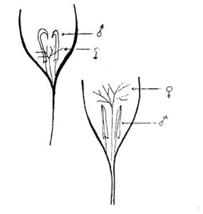 חתך בפרח כרכום השבכה מאזור הגולן לעומת כרכום הרמון מאזור הר-הנגב: בעוד באוכלוסית הגולן הצלקות גבוהות לרוב מהאבקנים, תכונה המפחיצה את הסיכוי להאבקה עצמית – הרי בכרכום הרמון המאבקים תמיד גבוהים מהצלקות וקציהם מוטה מטה; על ידי כך מתאפשרת ביתר קלות האבקה עצמית באוכלוסיית כרכום הרמון. צויר על ידי ע.פרידמן ©