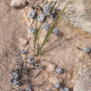צמחי הדגני מלעניאל מצוי במדרונות נחל סרפד, 15.4.2025 הר-הנגב. במדרון סלעי-אבני ניתן למצוא פרטים בודדים וקטנים של מלעניאל לפני השתבלות. בתמונה משמאל רואים קרקפות יבשות של כוכב ננסי אשר זרעיו "החליטו "בצדק" לא לנבוט השנה, צילם א.ש. ©