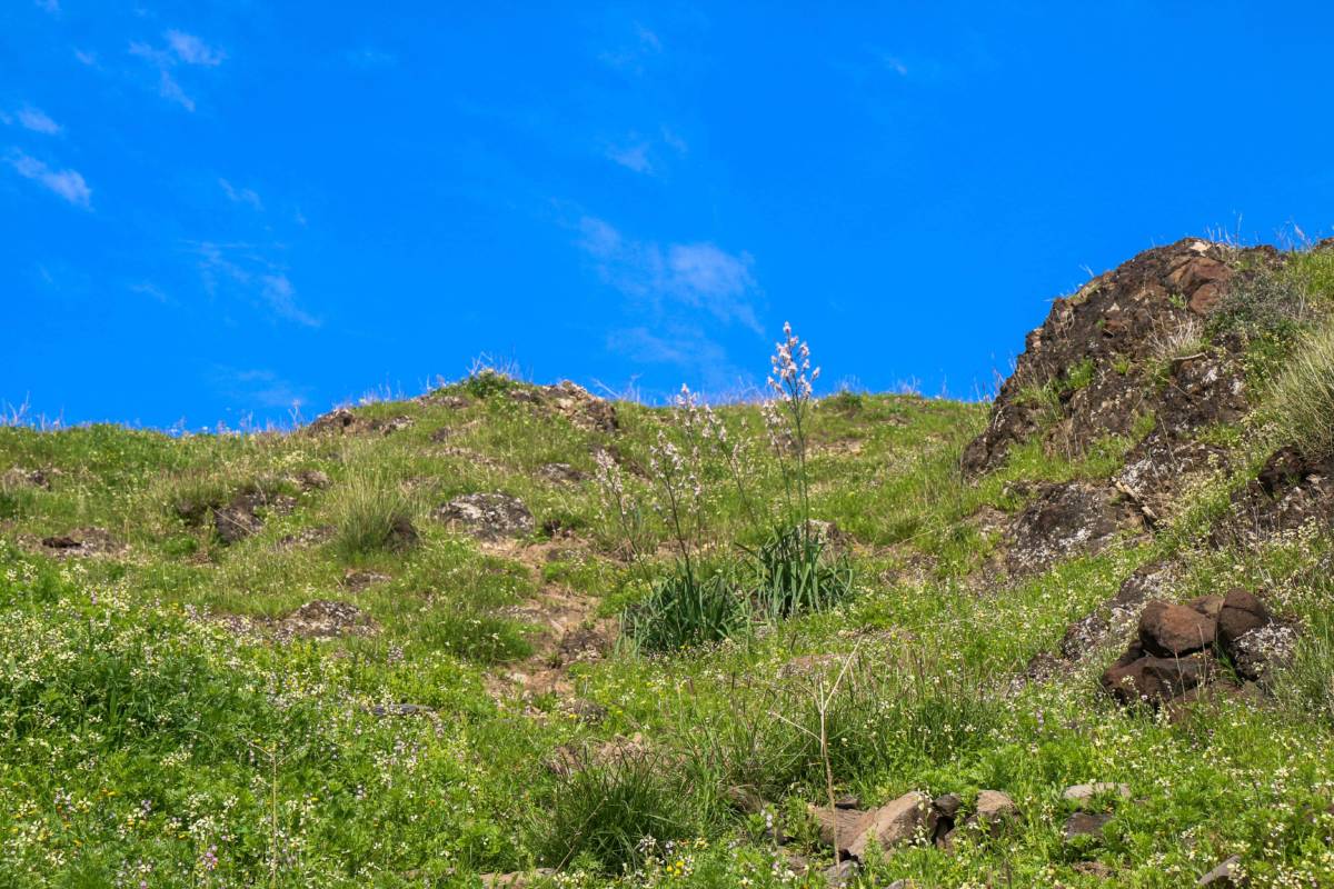 אבן מצבה לזכרו של "שבו" שבתאי לוי חוקר סיני, צלמה טליה אורון ©, ממצפה נחל יששכר נשקף נוף "מהפנט" על חגורת הצומח התחתונה של הגליל הדרום מזרחי בו שולטת שיחיה פתוחה של שיזף השיח ובתות עשבוניות נשלטות על ידי דגניים בעיקר חד-שנתיים.