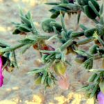 פגוניה רכה, מימין: הפרח בן 5 עלי כותרת ורודים ועשרה אבקנים. העלים אליפטים מעט בשרניים, בבסיסם שני עלי לואי קוצניים. הפרי הלקט. משמאל: צמח עמוס פרחים. צילמה ערגה אלוני©