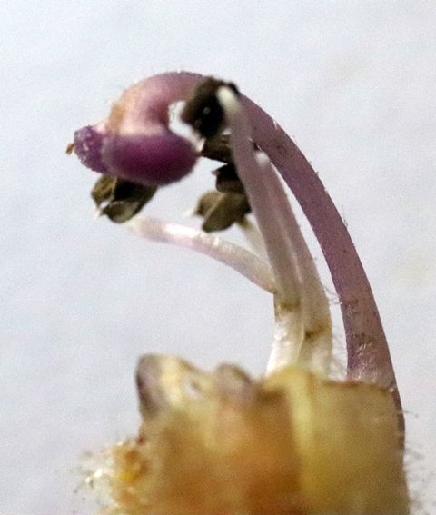 מימין: הפרח שעיר דו שפתני. מתחת לשפה העליונה בולטת צלקת העלי. באמצע: עלי לוואי וצינור הפרח. משמאל: פרח שהוסרה ממנו הכותרת נראים 4 אבקנים ועלי בעל צלקת כפופה. תמונות: ערגה אלוני ©